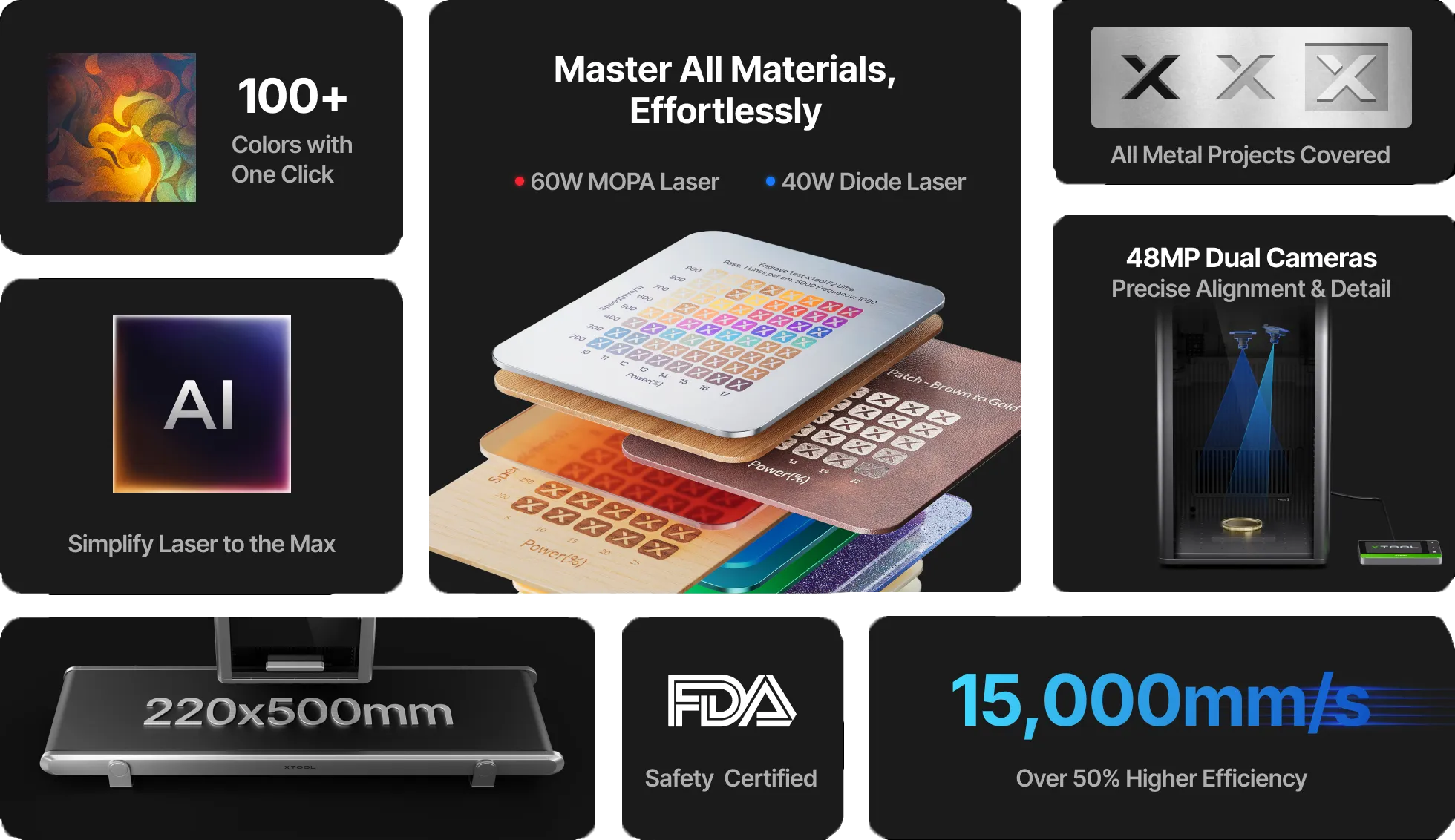 With dual laser sources — a powerful 60W MOPA fiber for metals and a versatile 40W diode for organics and coated surfaces — the F2 Ultra gives you two machines in one. And with AI smart engraving and a 48MP dual-camera system, setup is almost instant. Place your item, let the AI detect the material, preview the design, and engrave with unmatched precision.